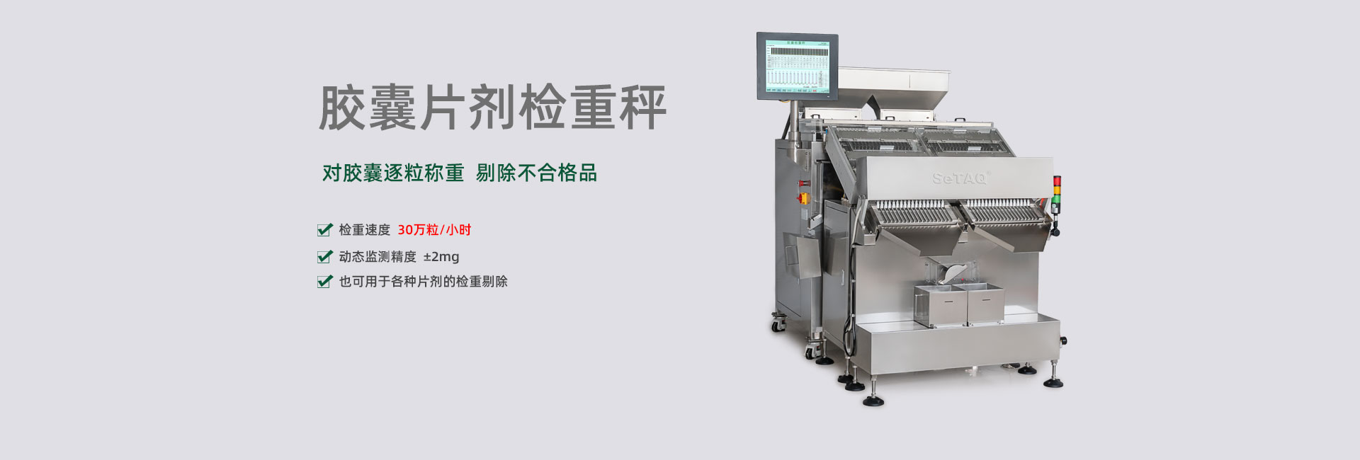 擁有近百項檢重專利和專有技術,開發的產品可高速、高精度地檢測膠囊、片劑、丸劑、軟袋、軟管、紙盒、藥瓶、紙箱、薄片及各種器械、零件的重量偏差或缺件